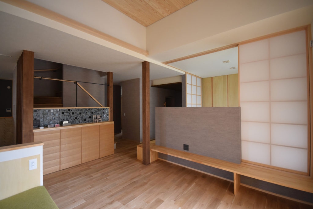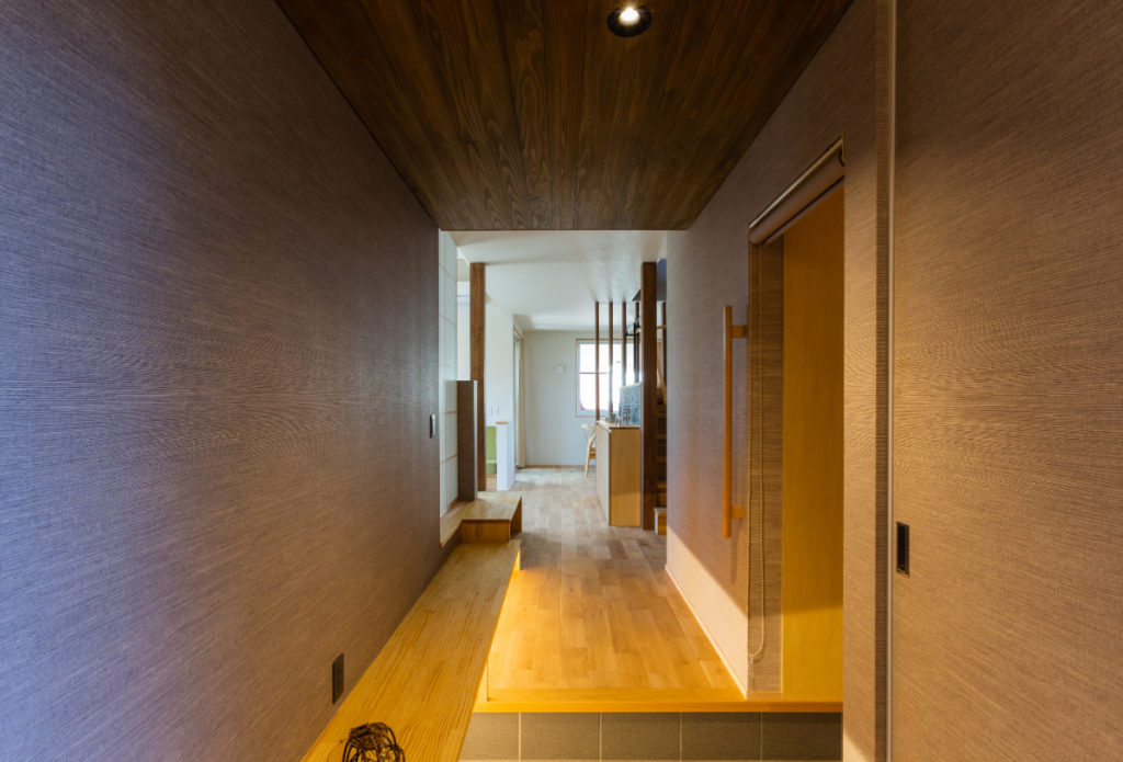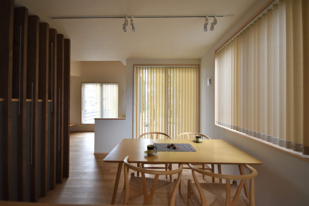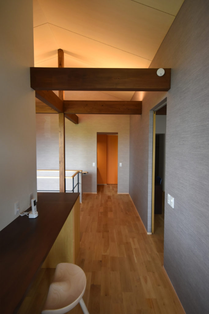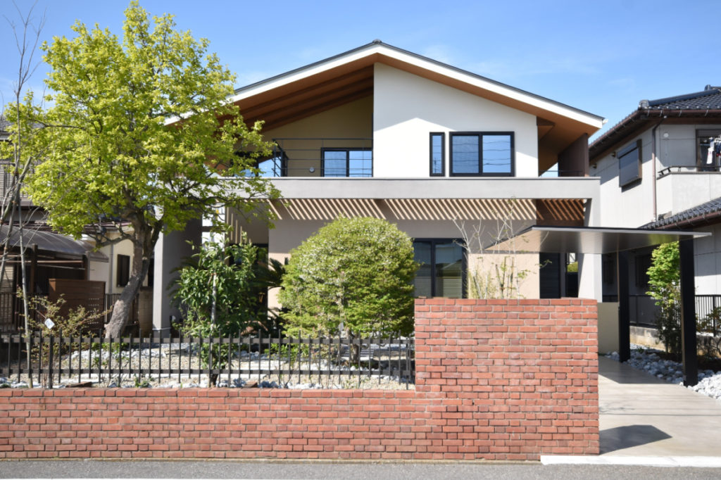 レンガの塀から大きなお庭、そこに響き合いながら溶け込むように建つ家。道路からアプローチ空間、迎え入れる玄関、個性的な内部空間、そしてテラス、庭へと。それぞれの個性を持った空間が移り変わりながら一体的に繋がっていく。適度な距離感の心地良さと一体感を。南側は庭を望む明るいリビングと和室を。また大きなテラスを挿入して空間に光と奥行きを与え、その先には大きな柿の木。日射、視線制御、庭との繋がり、外観の変化。テラスに面してダイニングとキッチンを設け、プライバシーと適度な開放感を。2Fは外と繋がる半屋外空間の心地良さを、また開放的なフリースペースに奥行きと憩いを与えています。