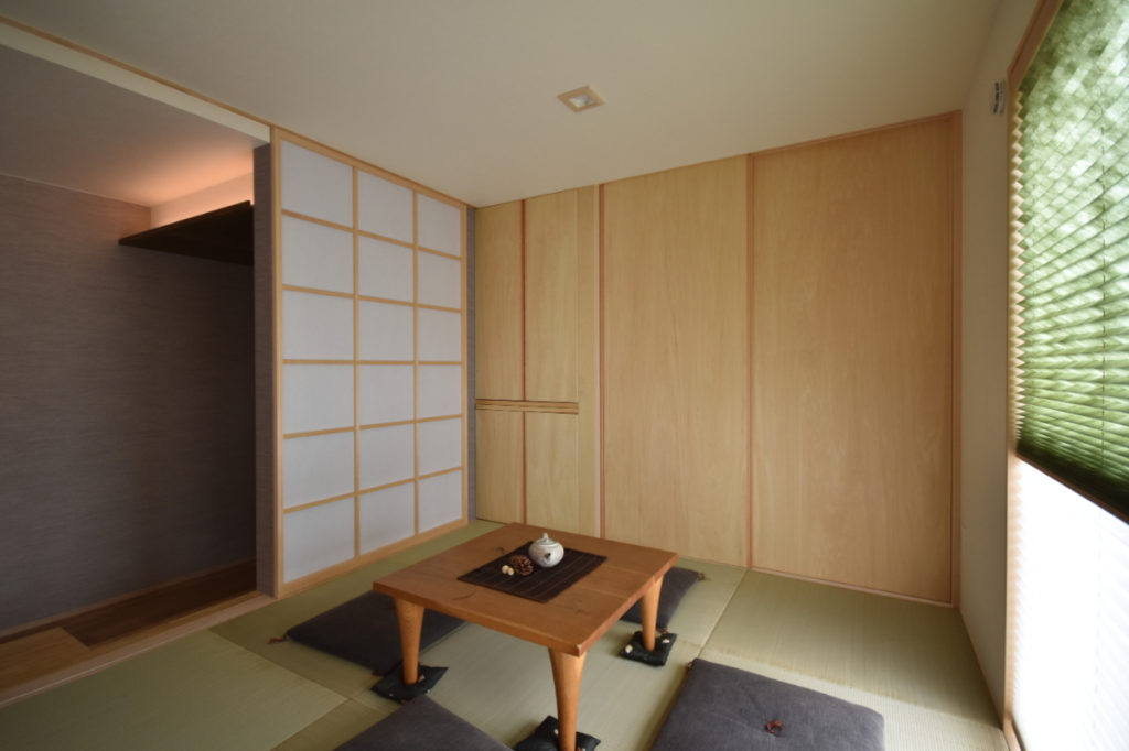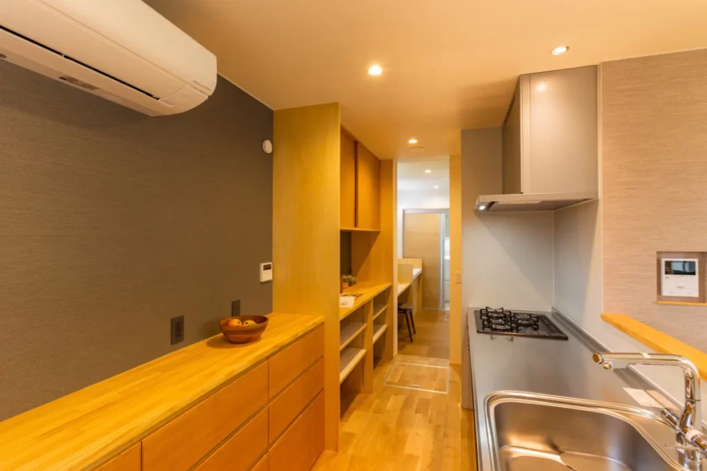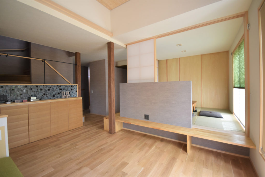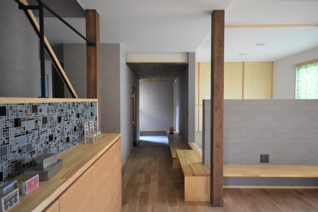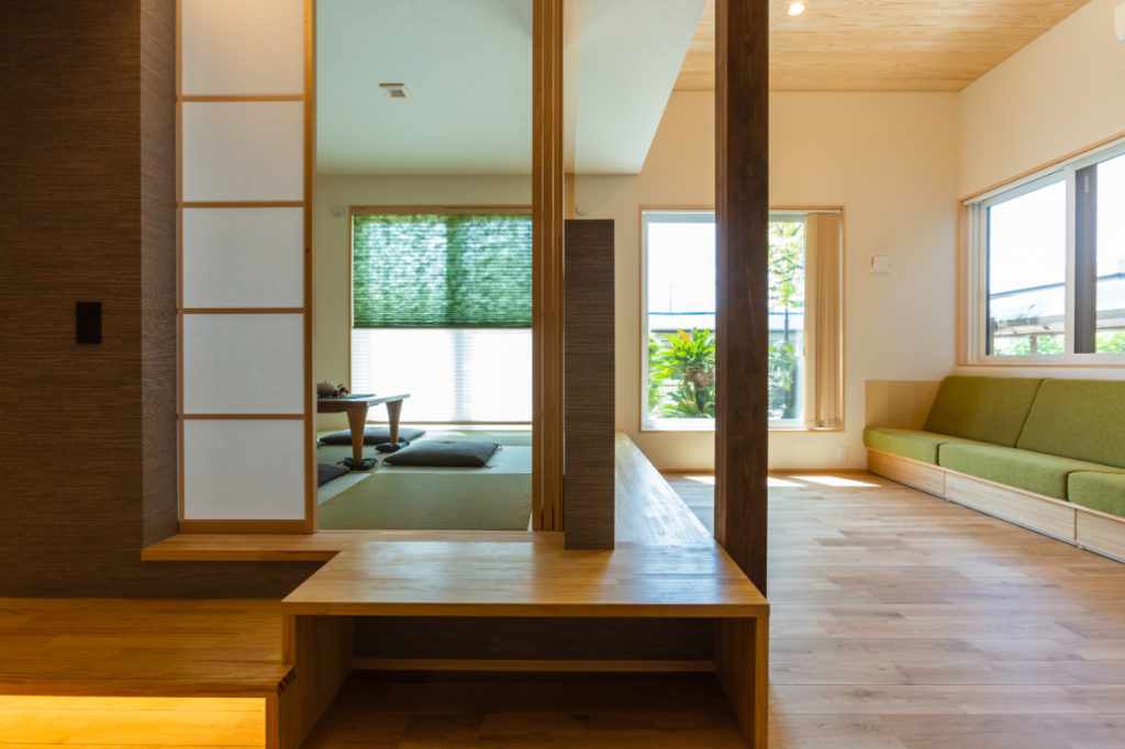レンガの塀から大きなお庭、そこに響き合いながら溶け込むように建つ家。道路からアプローチ空間、迎え入れる玄関、個性的な内部空間、そしてテラス、庭へと。それぞれの個性を持った空間が移り変わりながら一体的に繋がっていく。適度な距離感の心地良さと一体感を。南側は庭を望む明るいリビングと和室を。また大きなテラスを挿入して空間に光と奥行きを与え、その先には大きな柿の木。日射、視線制御、庭との繋がり、外観の変化。テラスに面してダイニングとキッチンを設け、プライバシーと適度な開放感を。2Fは外と繋がる半屋外空間の心地良さを、また開放的なフリースペースに奥行きと憩いを与えています。