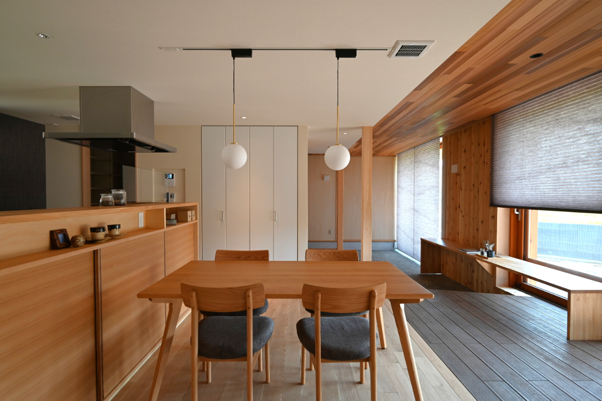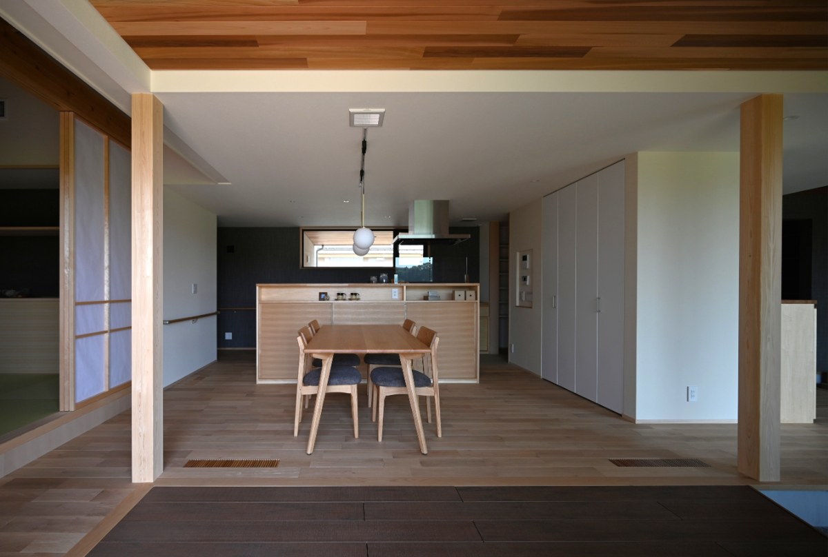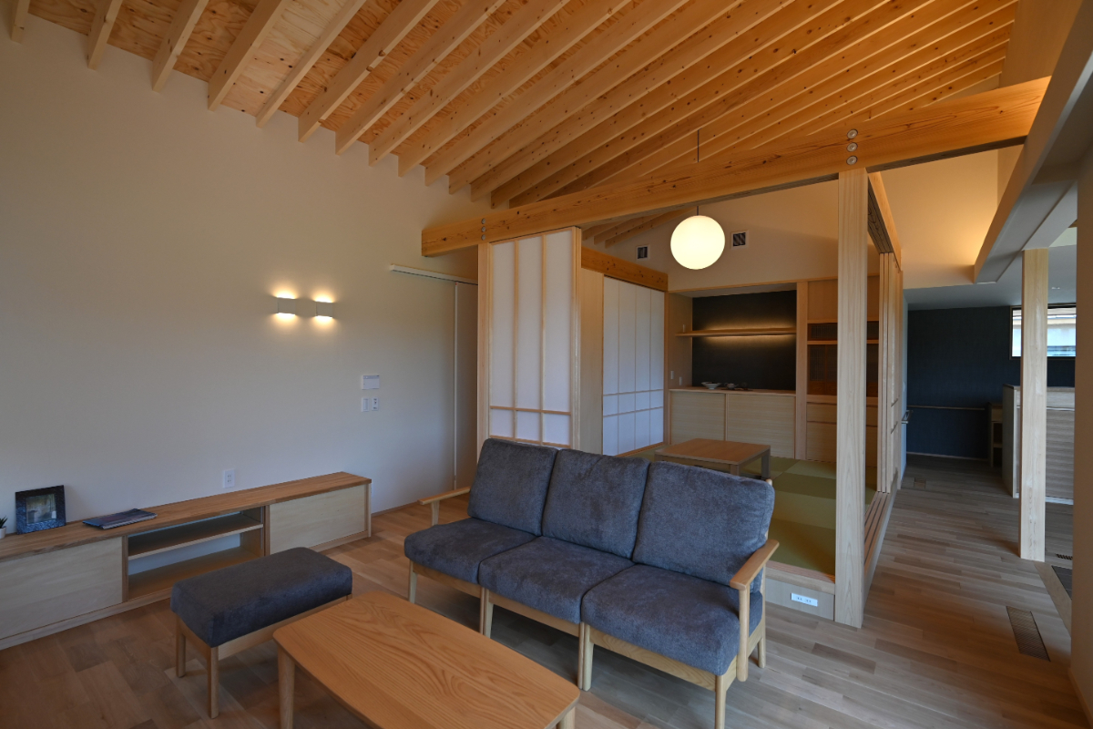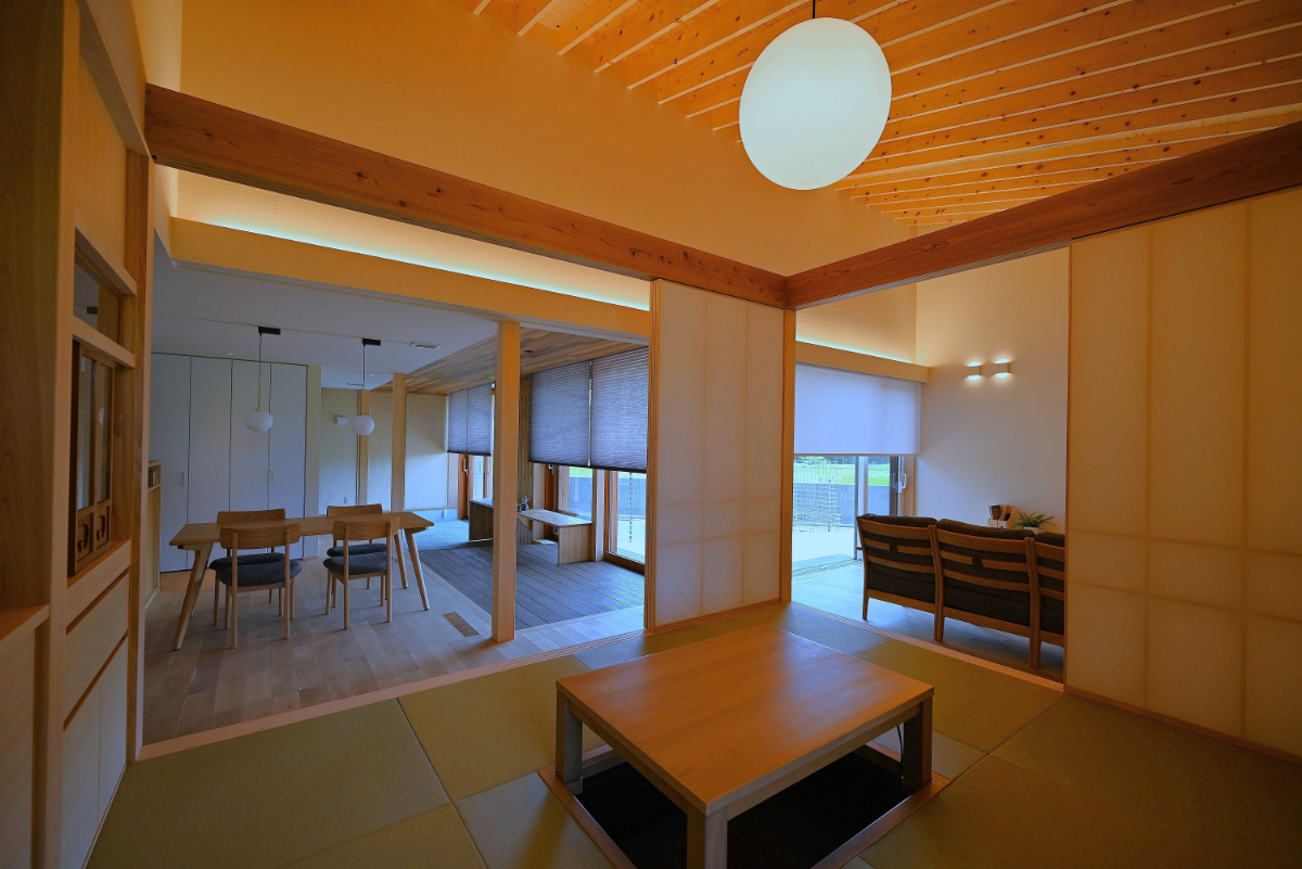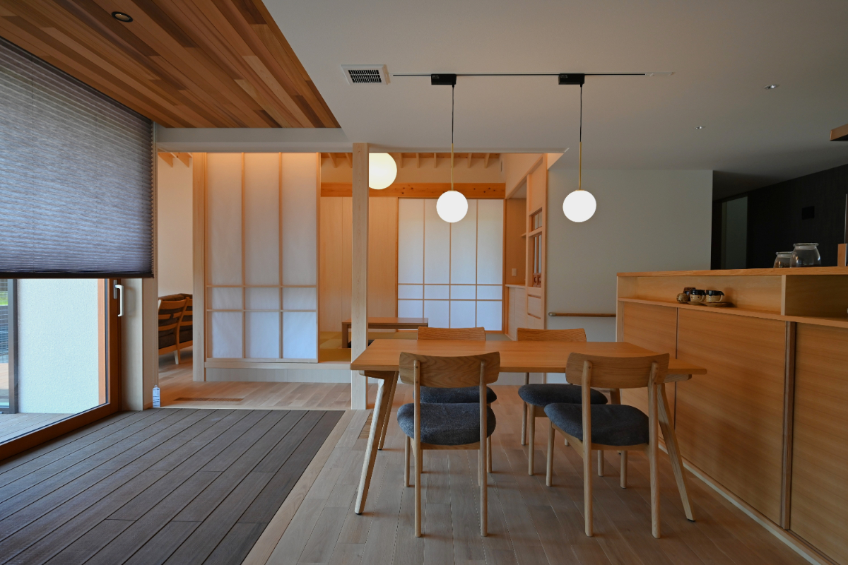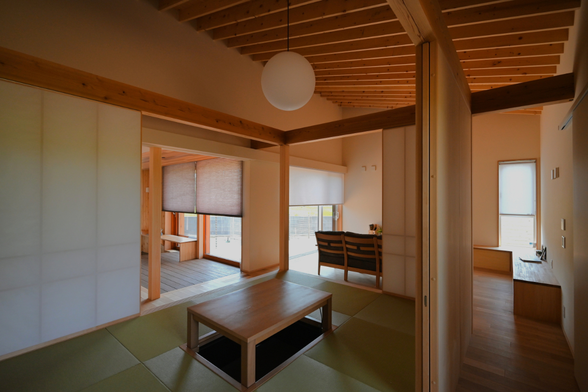 ダイニングキッチンからは土間、デッキテラス、庭へと繋がる。このデッキは庭から内部に相互貫入する形とし、外と中の繋がりを曖昧にし心地良さを感じられるようデザインした。リビングと和室は勾配天井により趣を変え開放感と可変性を。多方向から光と風を取り込み庭を眺めながら時の移ろいと落着きを感じられる空間に。家の中央に配した小上がりの和室は障子で仕切り程よい独立性を持たせながら緩やかに繋がり可変的で多様な居場所となる。