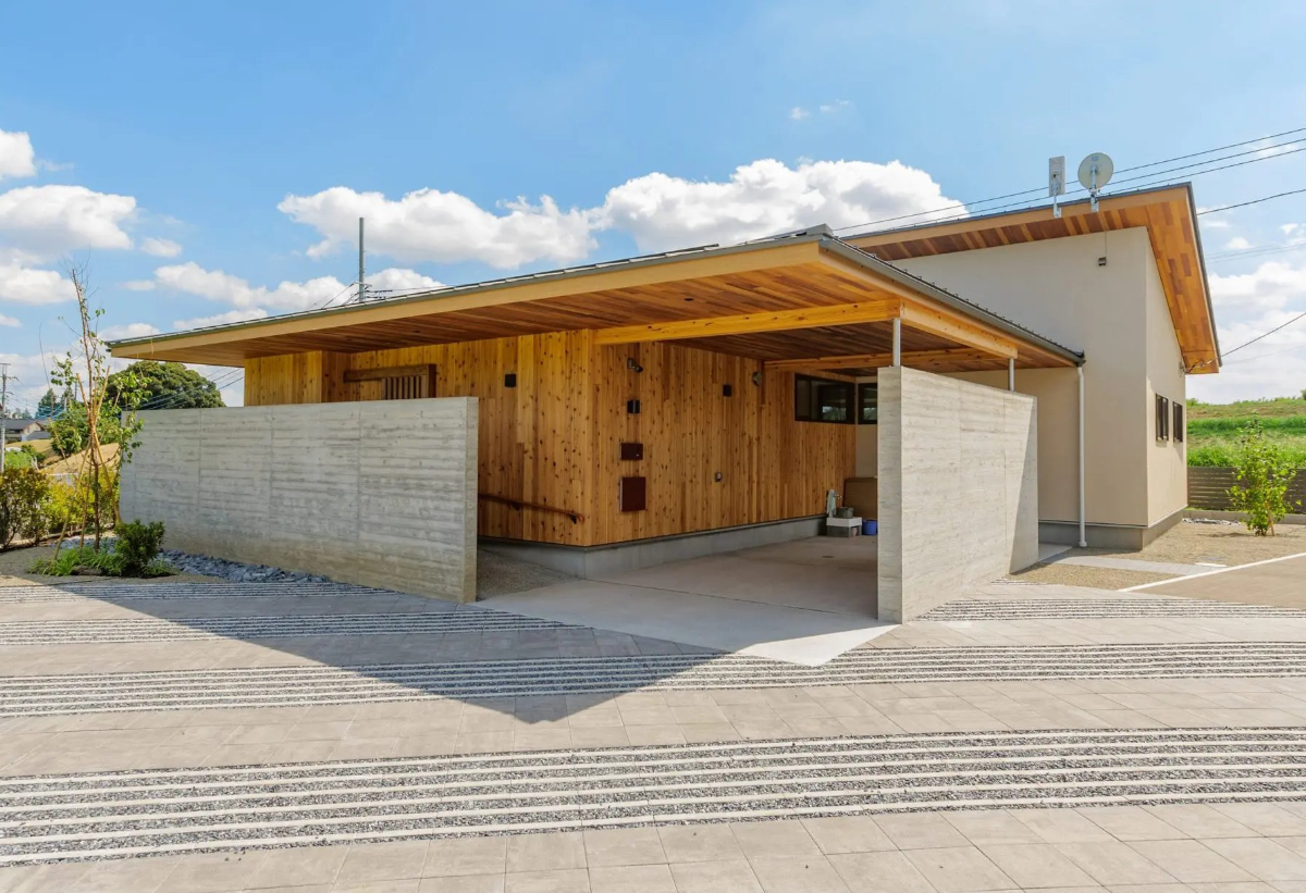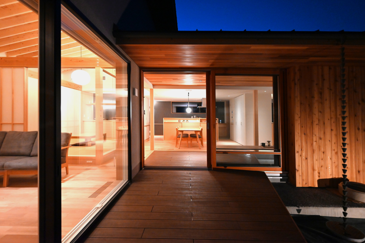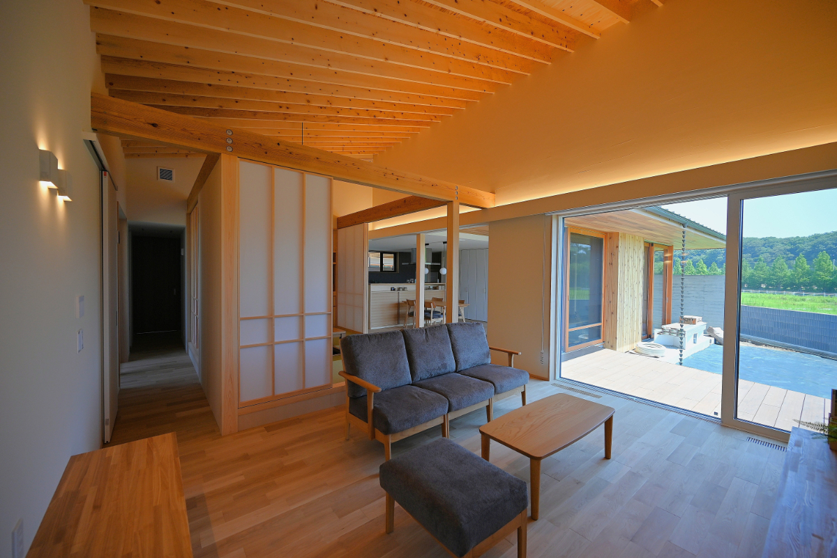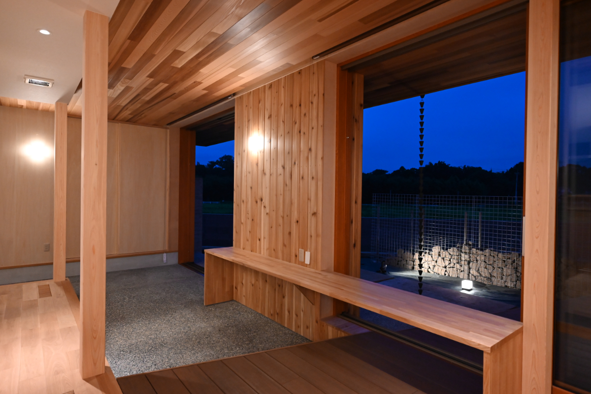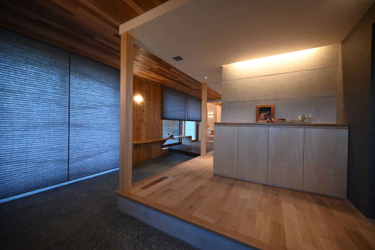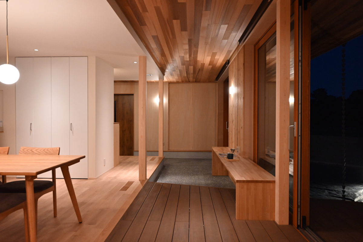土間空間は来客のおもてなしや休憩など多用途に活用。テラスは内部を外部へ延長し、土間は外部を内部へ取り込む。この2つを深い庇と大開口とともに混在させることで魅力的な中間領域として生活に幅と趣を与えた。
