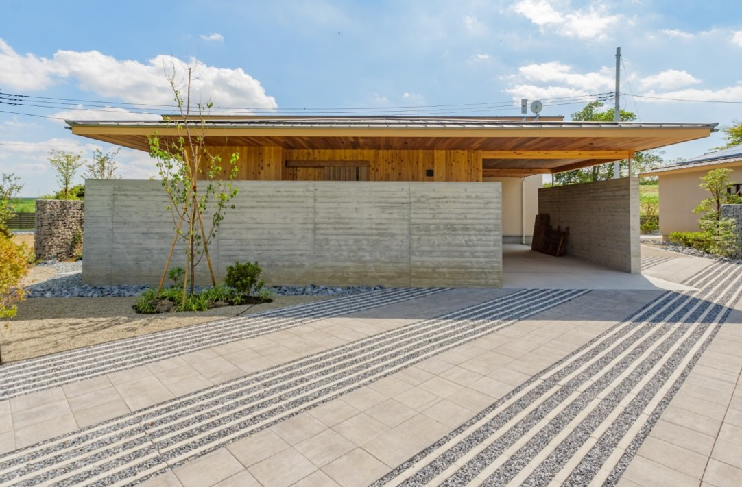 緑あふれる中庭が迎え入れ、深い庇と風除けを兼ねたアプローチ空間、通り土間、庭、畑へと緩やかに繋がっていく。開放性と視線制御、風除けを両立したデザインに。