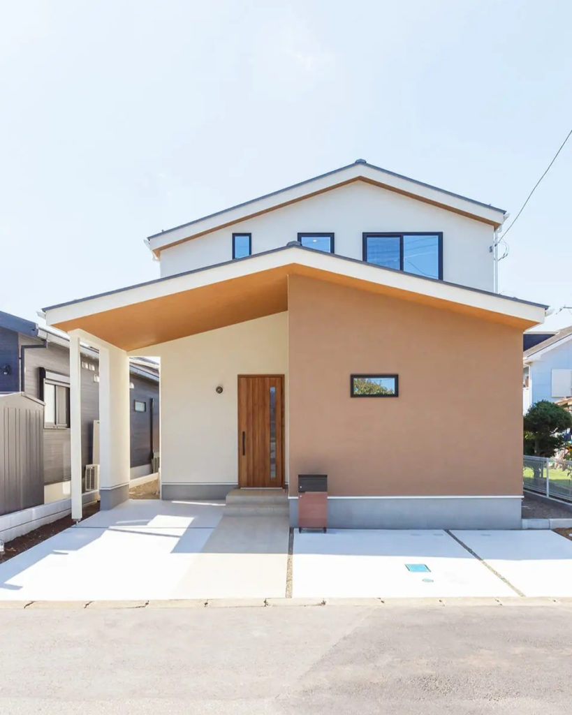 駐車スペースを兼ねた屋根のある玄関アプローチで奥行感と快適性を。
