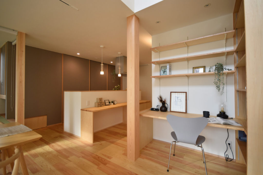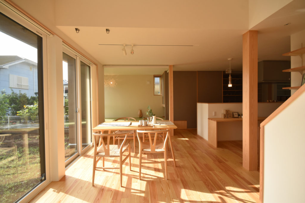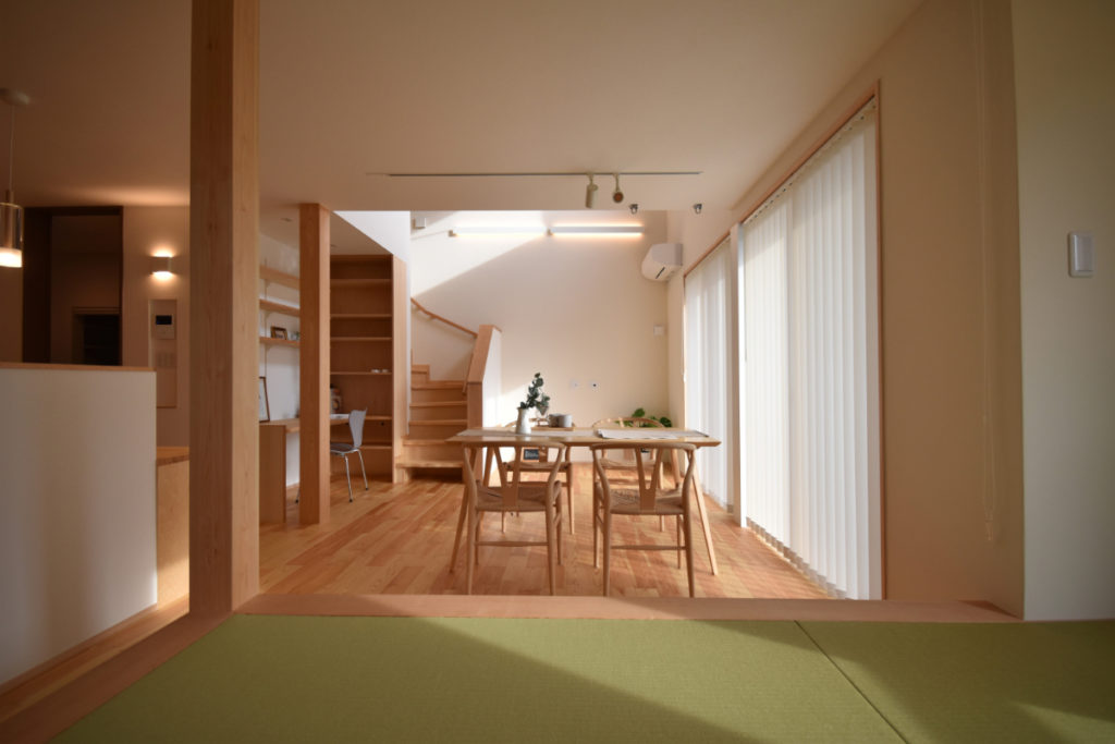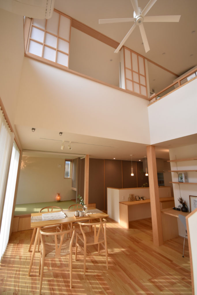 玄関を抜けると開放的なキッチンカウンター、ダイニング、小上がりの和室、開放的な吹抜けリビング、そして大きなお庭へと繋がる。生活スタイルに合わせた回遊動線でそれぞれの場へ。いろいろな居場所を。