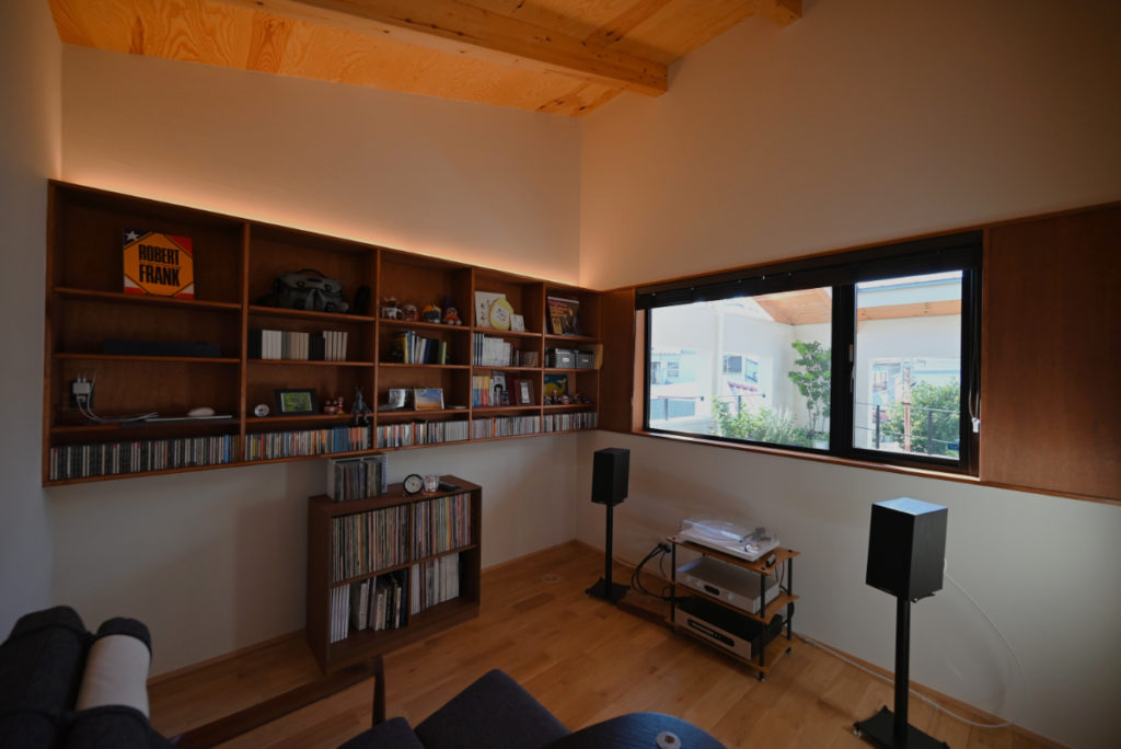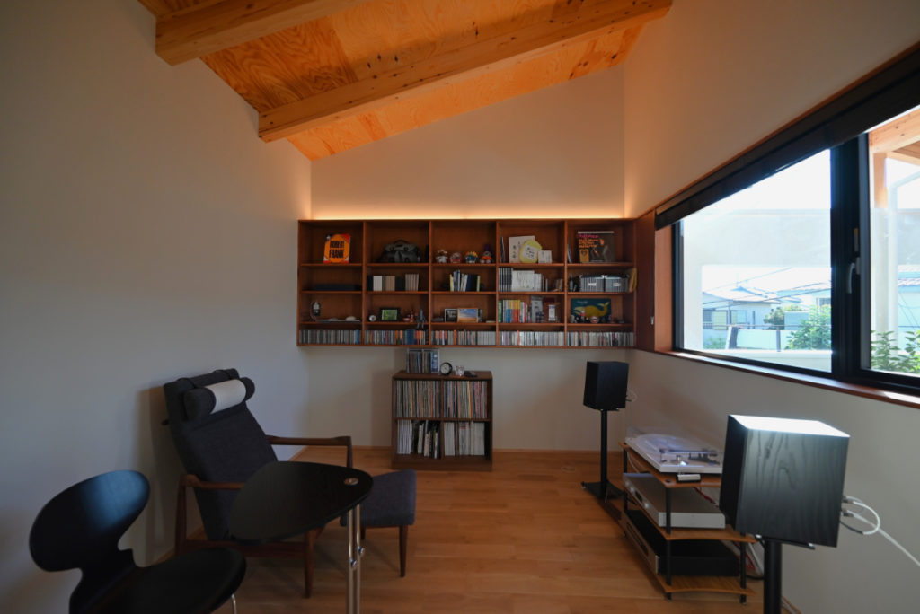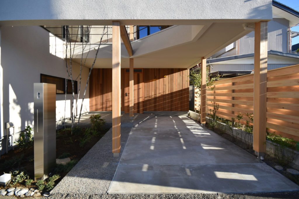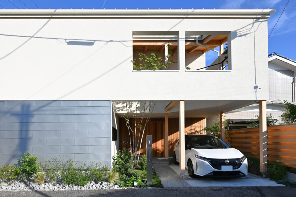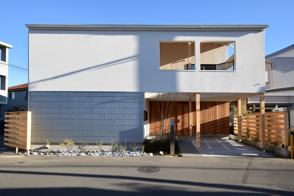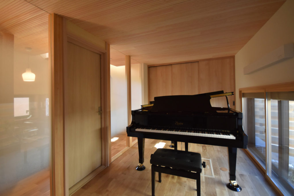 閑静な住宅地に建つ音楽と自然を愛するご夫婦のための住宅である。形態はシンプルな切妻屋根で覆い街並みに溶込む佇まいに。生活スタイル、街との関係、温熱環境を考慮、この場のポテンシャルを生かすため南西側に半屋外の多用途な中間領域を挿入して全体を構成した。ここは街とのバッファーとして機能し、利便性、心地良さ、街との適度な繋がり、視線制御、距離感の操作など多用途な場となる。この場を中心に個々の場が繋がりシークエンスを創りながら各居場所を創る。また省エネ性と快適性により開口形状を検討、季節による日射制御と取得、風の流れを効率的に。夏季は小屋裏エアコン、冬季は床下エアコンにより家全体を均等に心地良く快適な計画としている。趣のある半屋外のアプローチから玄関へ、坪庭を望みながら趣のあるピアノ室、小さな居場所ヌック、2階へと。開放的なリビングとそこに繋がるアウトドアリビングは快適な場となりプライバシーを保ちながら光と風と緑の溢れる空間に。それぞれの領域が心地良く繋がり響き合いハーモニーを奏でるように。