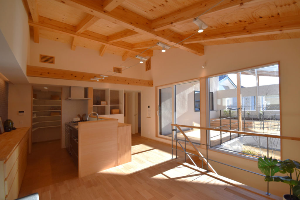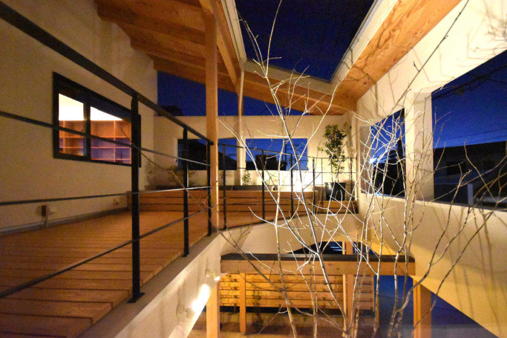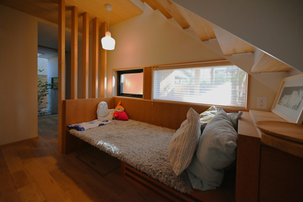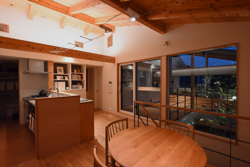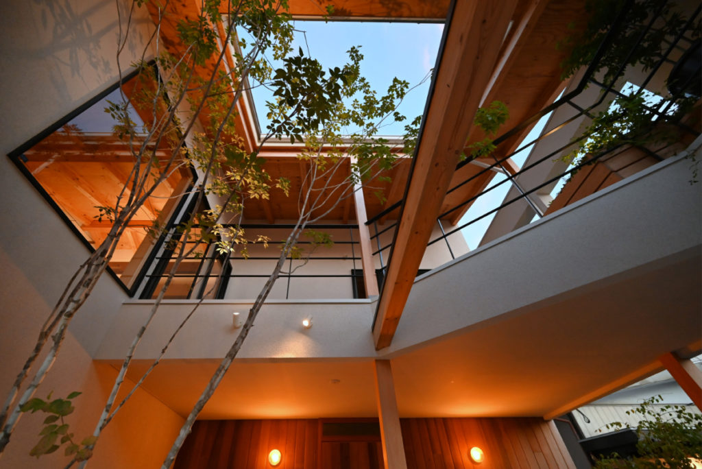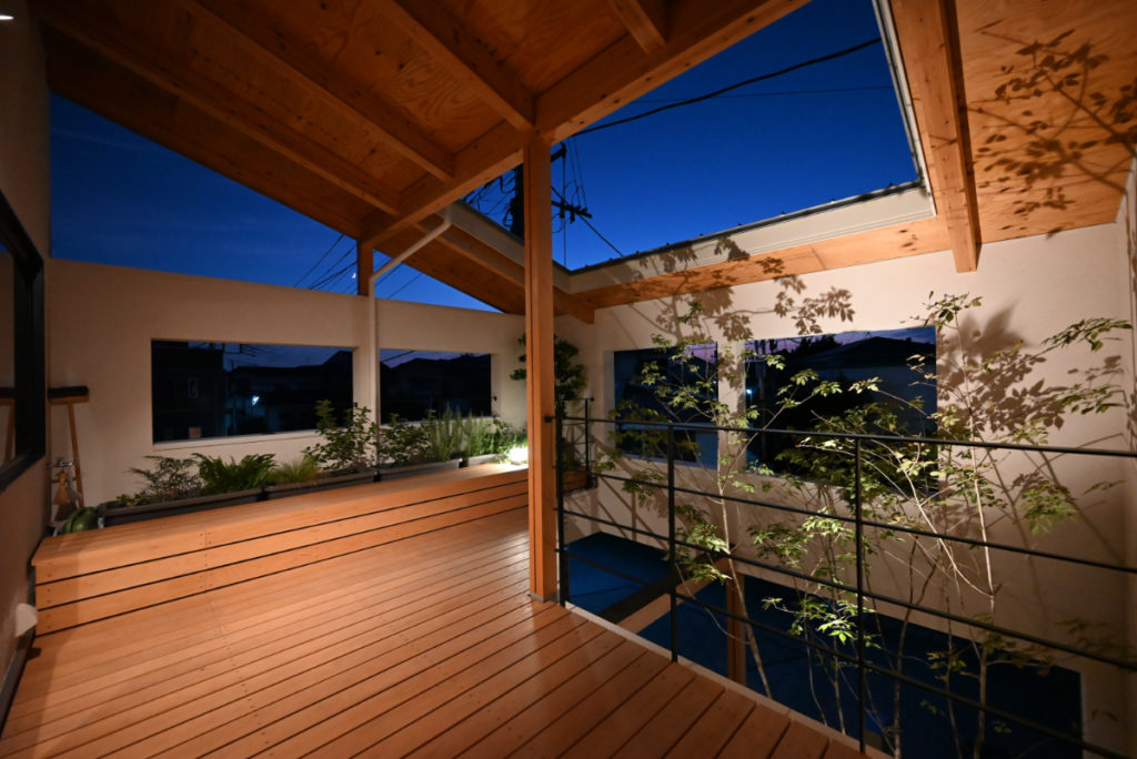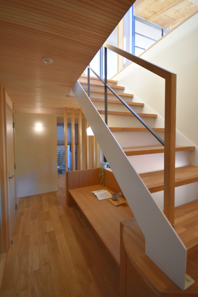 閑静な住宅地に建つ音楽と自然を愛するご夫婦のための住宅である。形態はシンプルな切妻屋根で覆い街並みに溶込む佇まいに。生活スタイル、街との関係、温熱環境を考慮、この場のポテンシャルを生かすため南西側に半屋外の多用途な中間領域を挿入して全体を構成した。ここは街とのバッファーとして機能し、利便性、心地良さ、街との適度な繋がり、視線制御、距離感の操作など多用途な場となる。この場を中心に個々の場が繋がりシークエンスを創りながら各居場所を創る。また省エネ性と快適性により開口形状を検討、季節による日射制御と取得、風の流れを効率的に。夏季は小屋裏エアコン、冬季は床下エアコンにより家全体を均等に心地良く快適な計画としている。趣のある半屋外のアプローチから玄関へ、坪庭を望みながら趣のあるピアノ室、小さな居場所ヌック、2階へと。開放的なリビングとそこに繋がるアウトドアリビングは快適な場となりプライバシーを保ちながら光と風と緑の溢れる空間に。それぞれの領域が心地良く繋がり響き合いハーモニーを奏でるように。