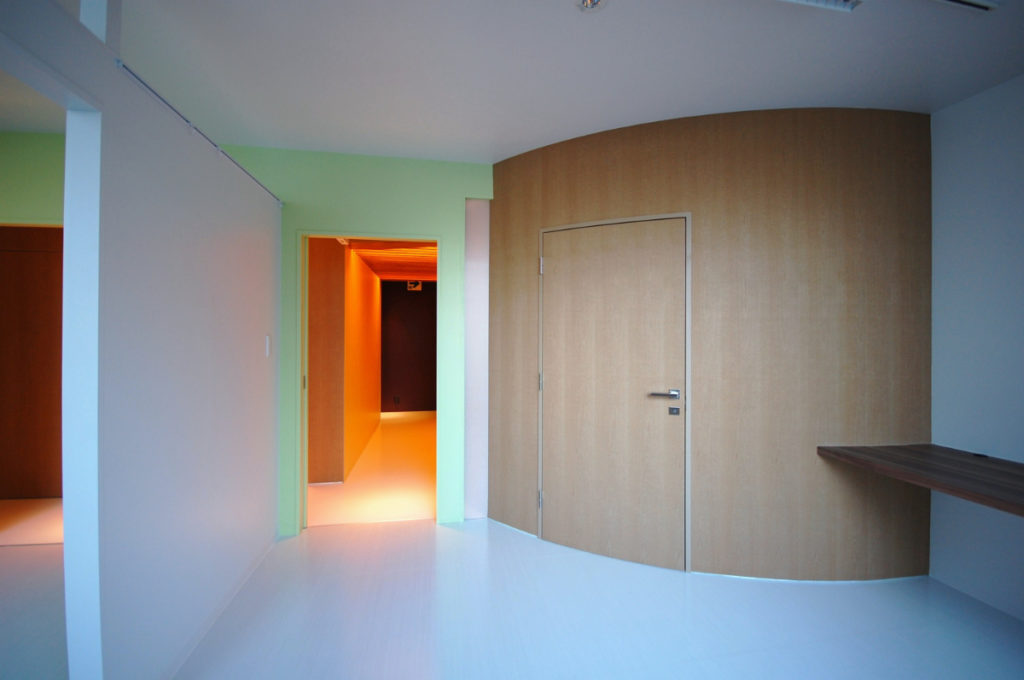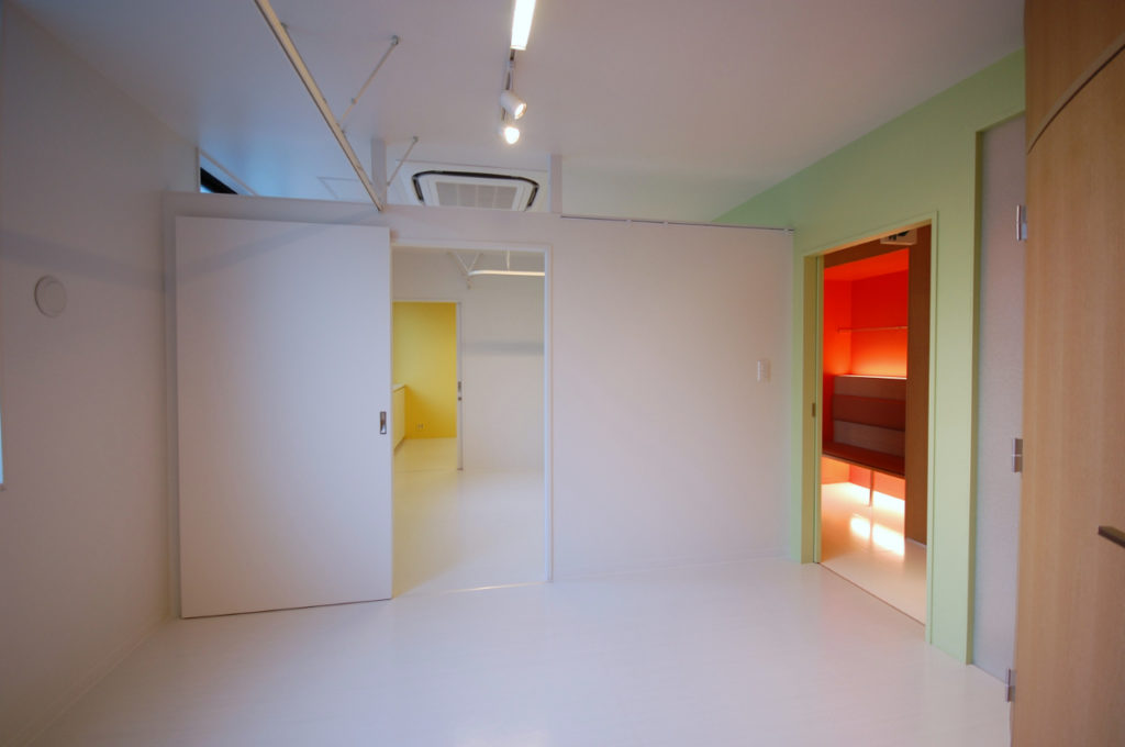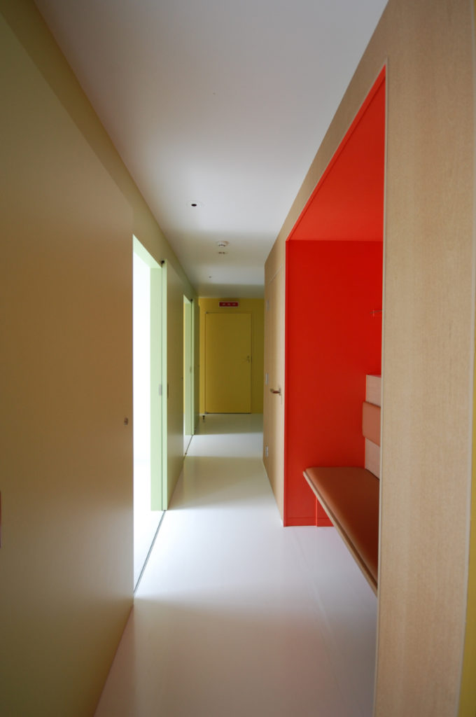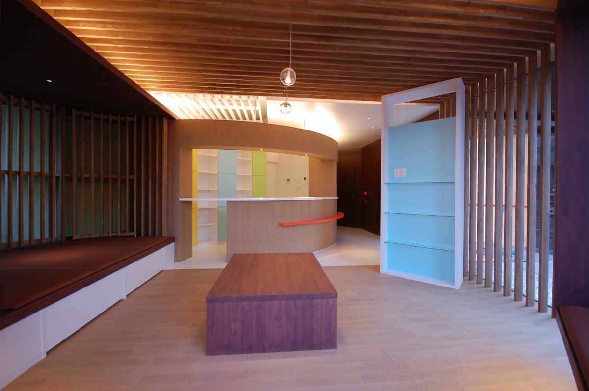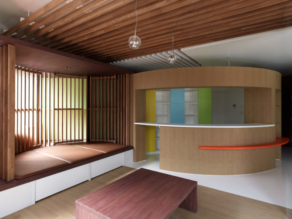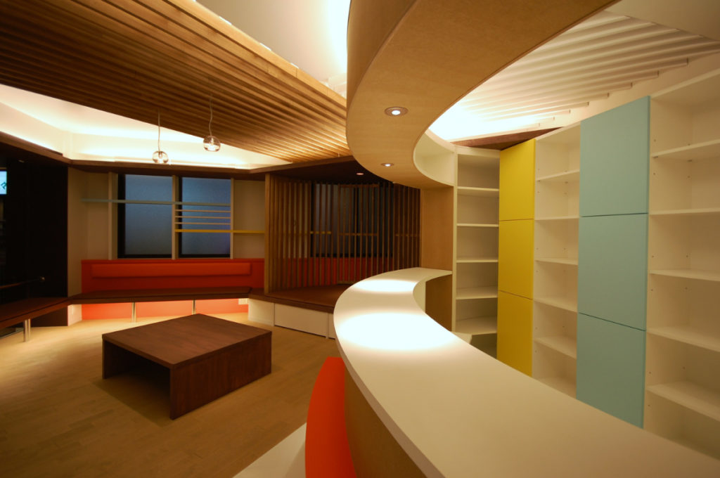 明るく、開放的、広がり、そして色によるリズム。今回はさらに色彩を増やし、そこに木の温かみを加えてバランスを取り、落ち着きのある空間としています。