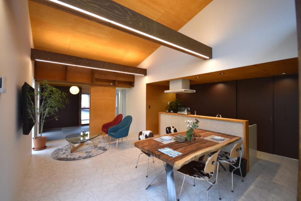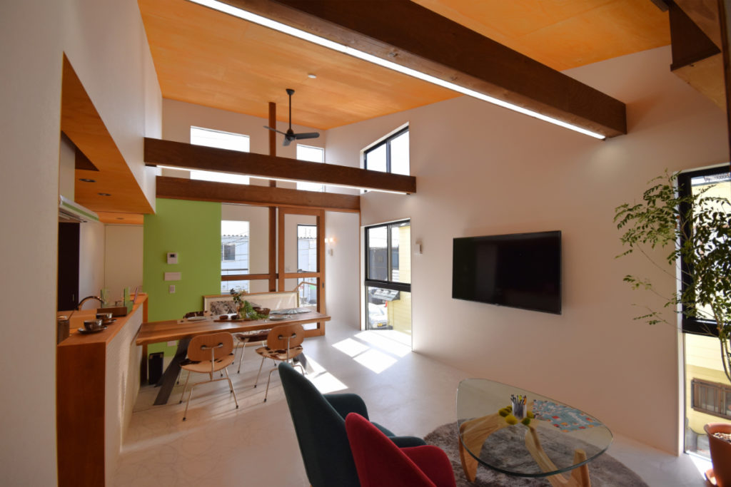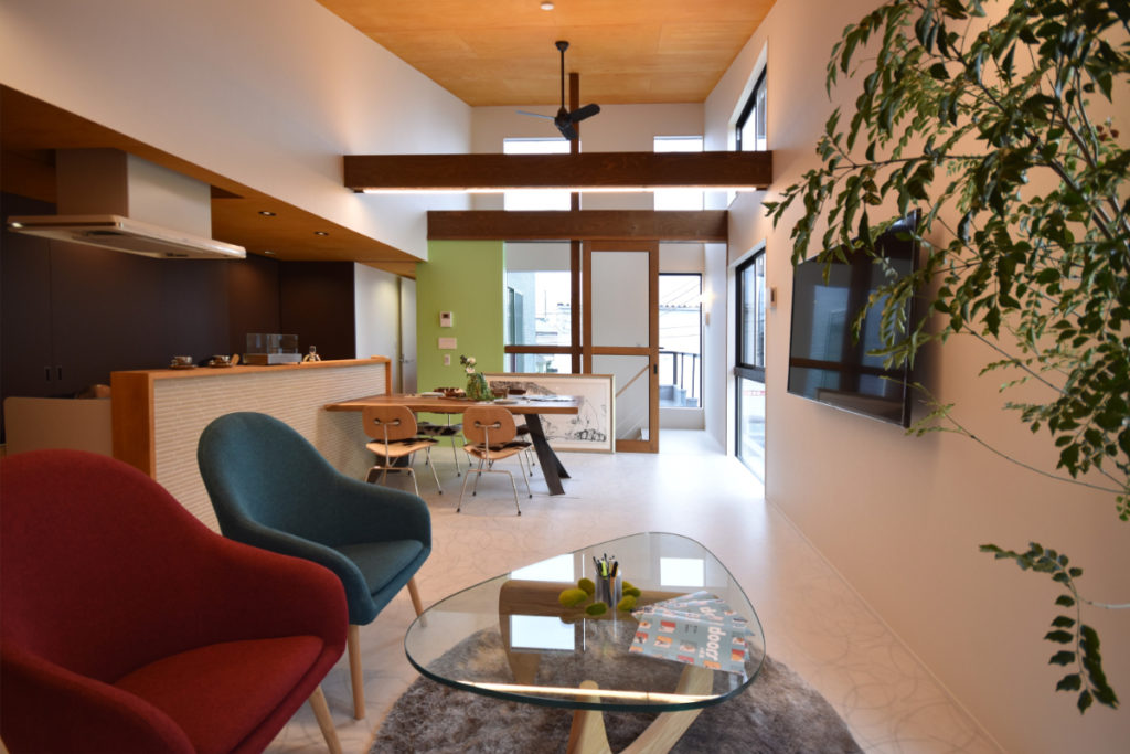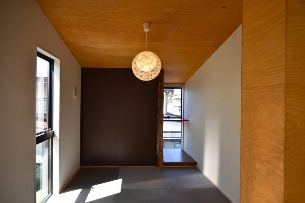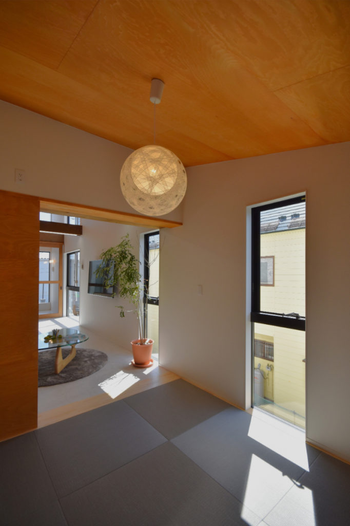 2階は日射をしっかりと確保しながら、開放感と心地良さ、落ち着きを両立。大きなテラスを囲むように居室を配置し、光と風が抜ける伸びやかな住環境を実現している。吹抜けを通して1階にも自然光を届け、上下階の繋がりを生み出している。勾配天井のリビングは明るさと開放感に加え、日射によって時間の移ろいを感じられる場所に。そこに繋がる和室や個室は、天井高を抑えることで落ち着きのある居場所としている。