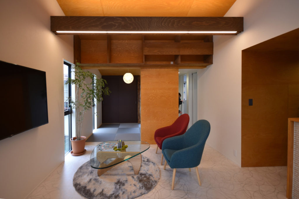 1階は庭とゆるやかにつながり、奥行きと落ち着きを感じる空間構成に。寝室や水廻りはプライバシーを確保しつつ、柔らかく外部と繋がる。リビングは障子によって仕切り、生活スタイルに応じて開放感を調整する。