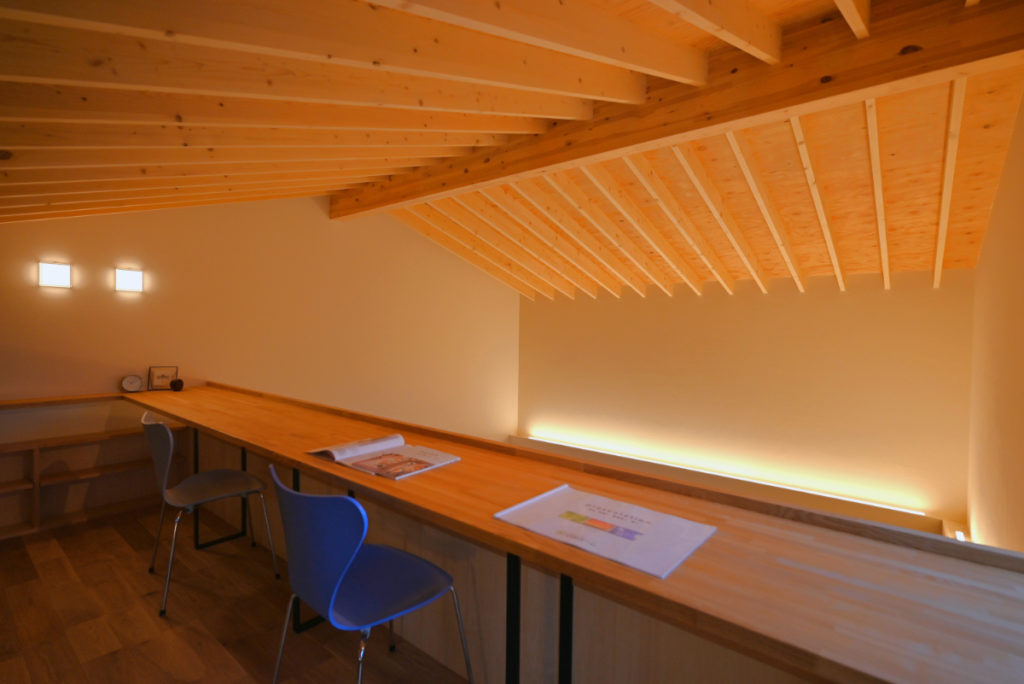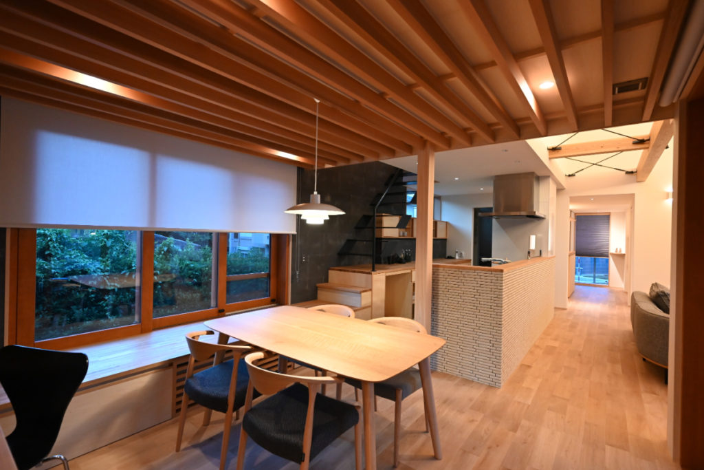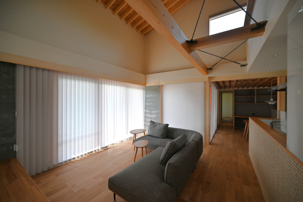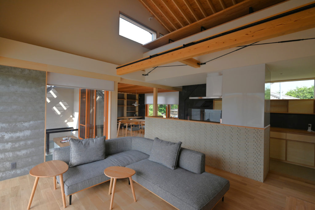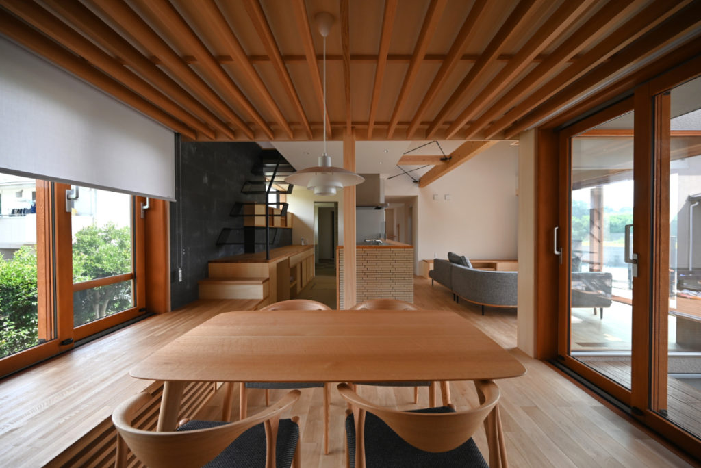 また季節による日射制御と取得、風の流れを効率的に計画し、夏季は小屋裏エアコン、冬季は床下エアコンにより家全体を均等に心地良く快適な計画としている。