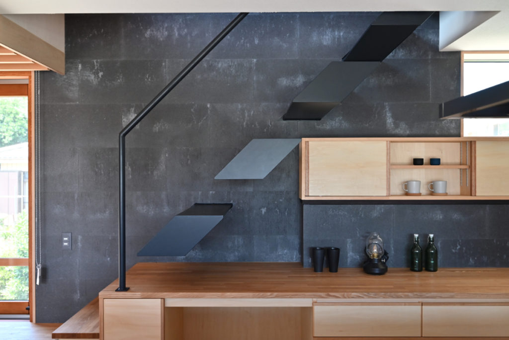 ダイニングは天井高を抑え落着きを与え、階段兼用のダイニングベンチや壁面収納、南北に設けた開口とテラスで外部と繋がる一体感と緑を近くに感じ風の通り抜ける心地良い空間に。ロフトは1階と繋がり空を感じられる特別な場に。屋上テラスは外階段で庭とつながり、空と庭を立体的に繋ぐアウトドア空間に。また、日射をリビングにもたらし立体的な光と風の流れを創る。花火鑑賞や星空を楽しみ癒される開放的で特別な場所。