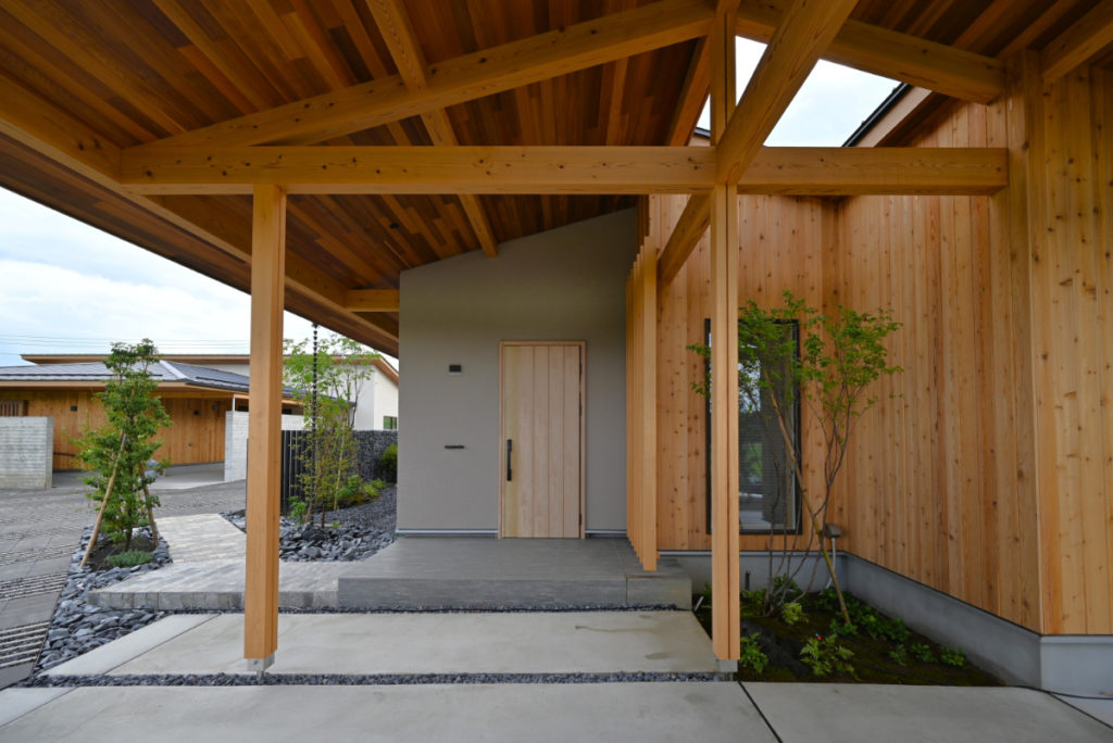 緑あふれる中庭が迎え入れ、深い庇とアプローチ、ホール、リビング、庭へと空間が緩やかに繋る。開放的なリビングの先の中庭は外部を感じ通風を兼ねる趣豊かな場に。