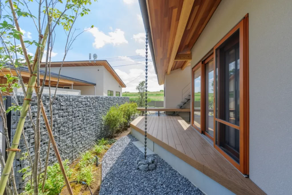 その上の屋根テラスは快適性と日射取得、省エネと心地良さを兼ねた中間領域として暮らしに豊かさをもたらす。庭の開放性と視線制御、風除けのデザイン操作。